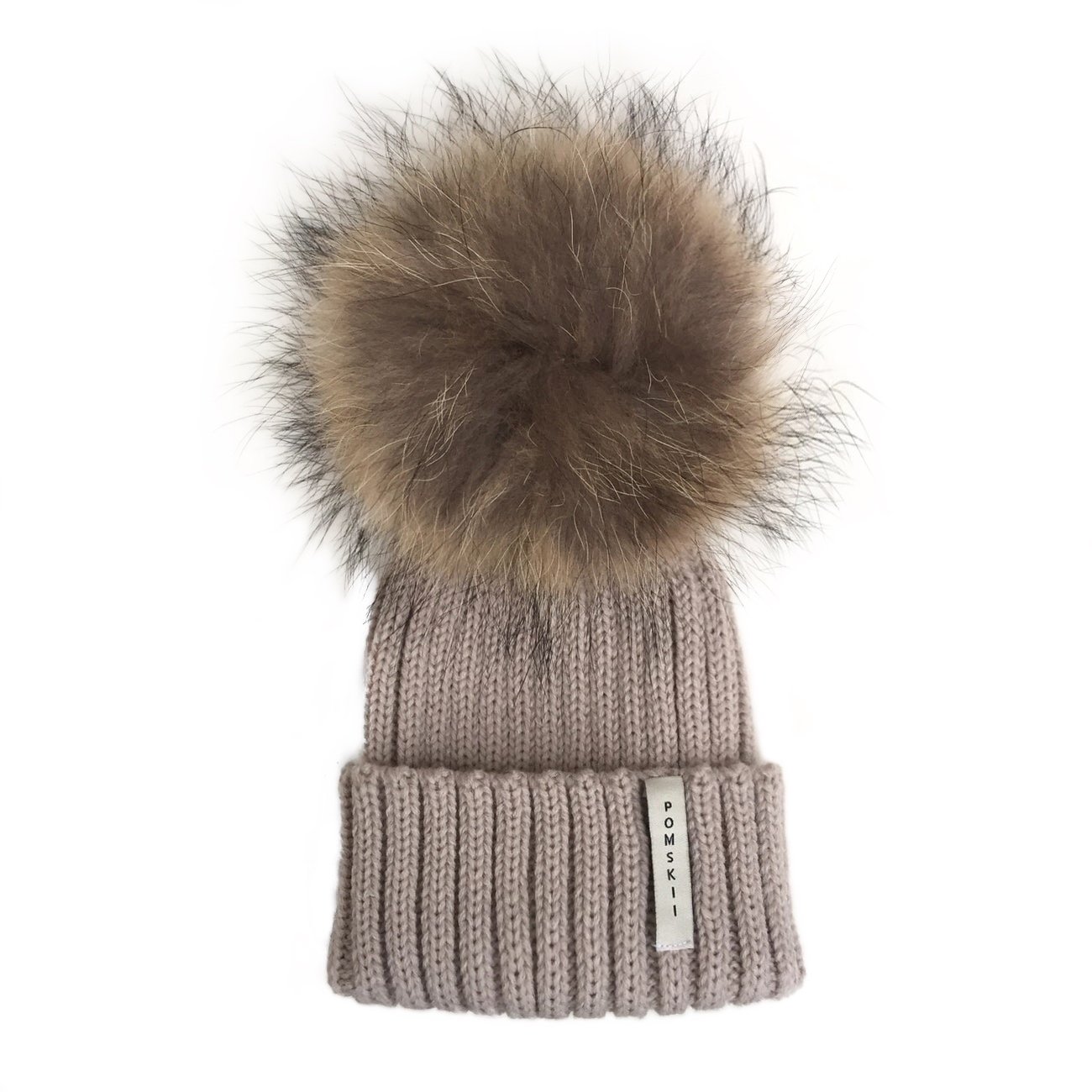 Children's luxury fur pom pom bobble hat in Beige with natural brown Pom.