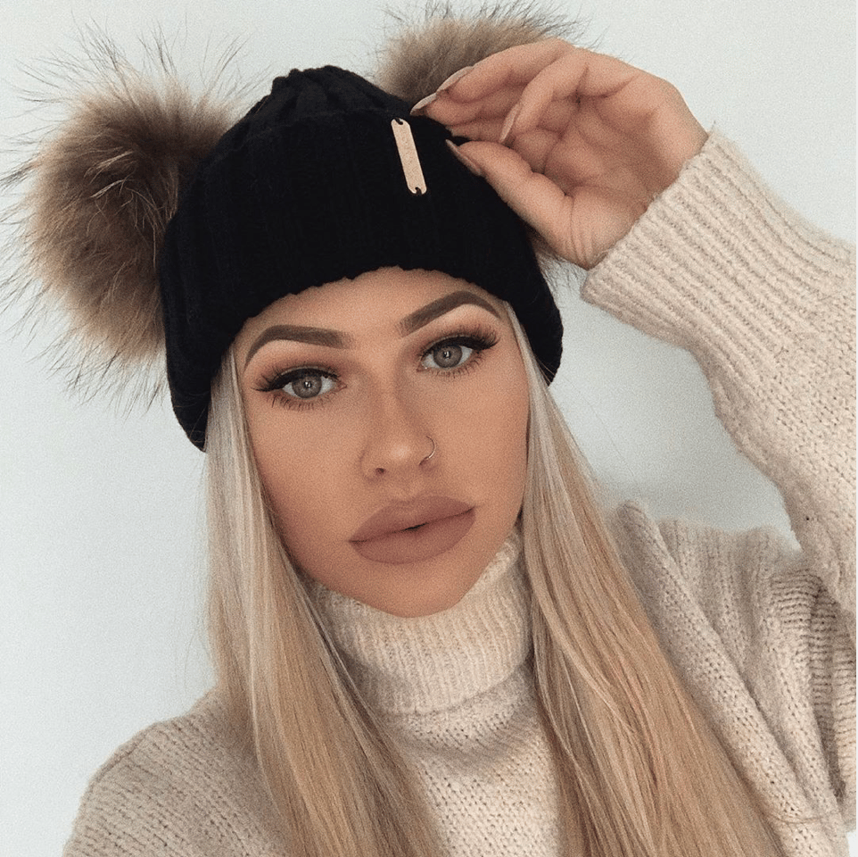 Luxury fur pom pom bobble hat in Black with double Natural Poms.