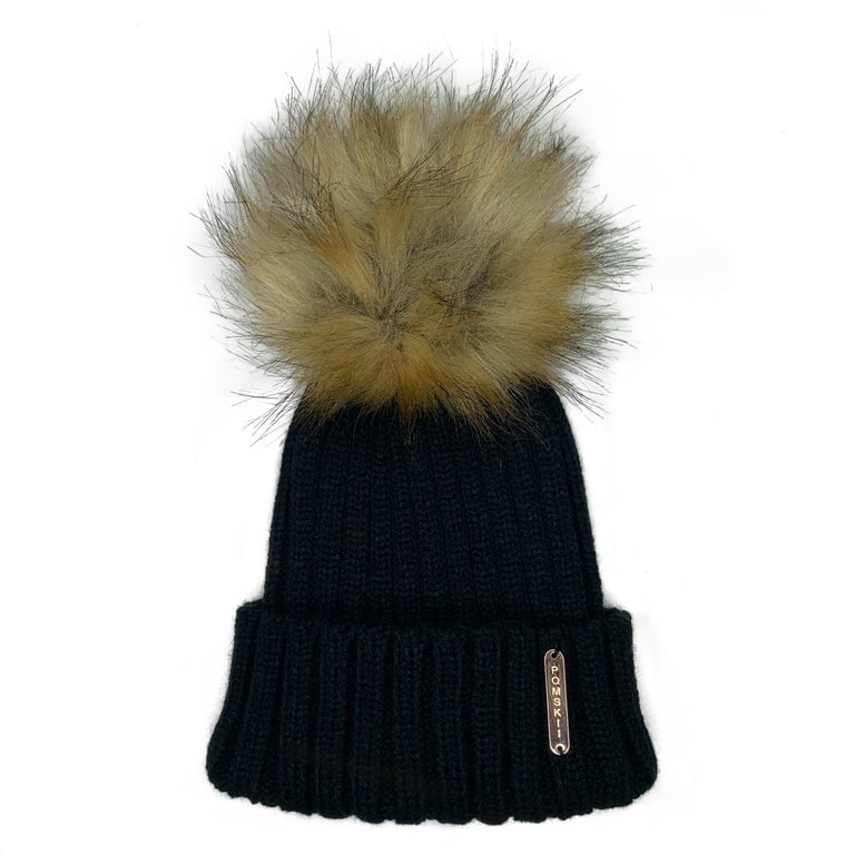 Luxury pom pom bobble hat in Black with faux fur Pom and gold metal logo.