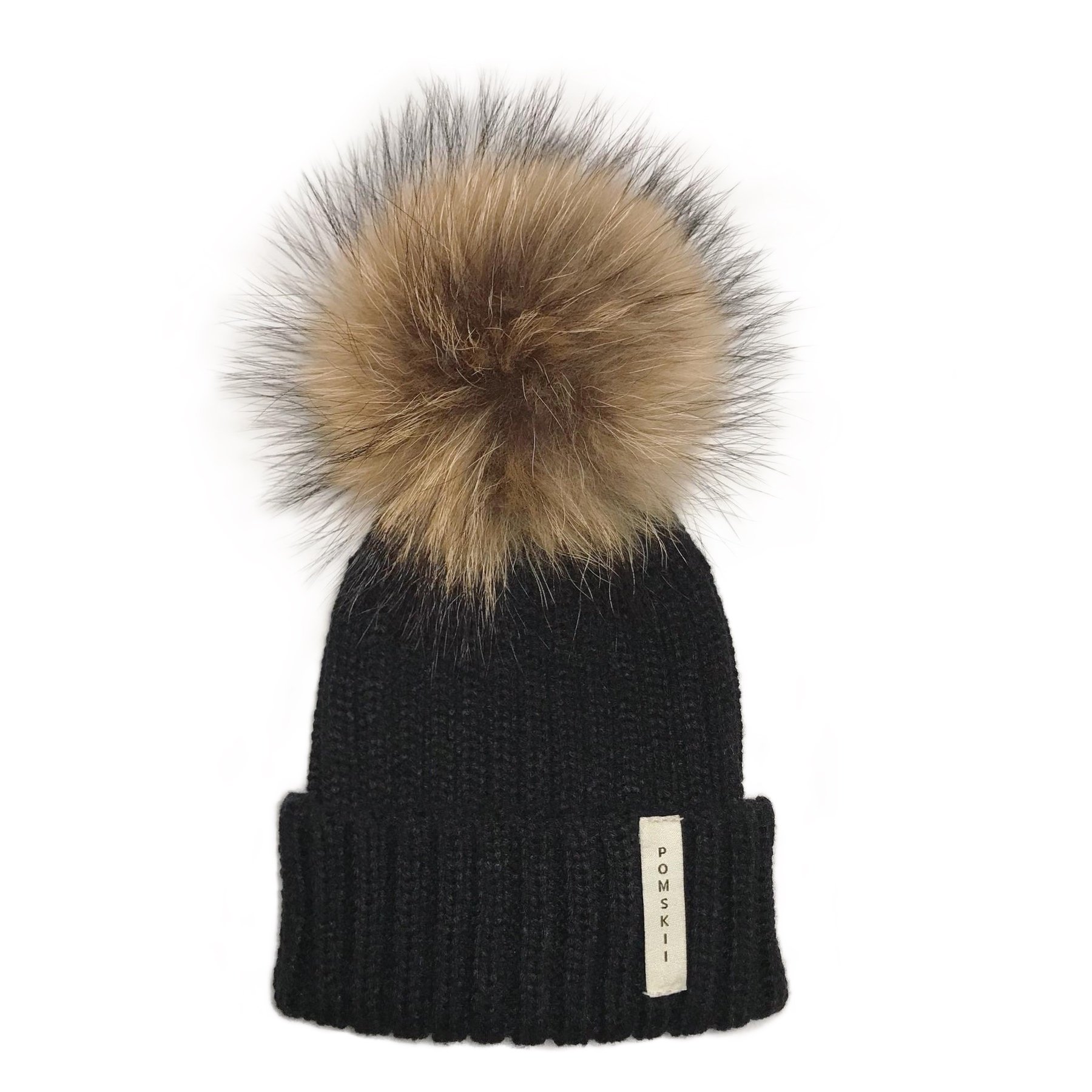 Children's luxury fur pom pom bobble hat in Black with natural brown Pom.