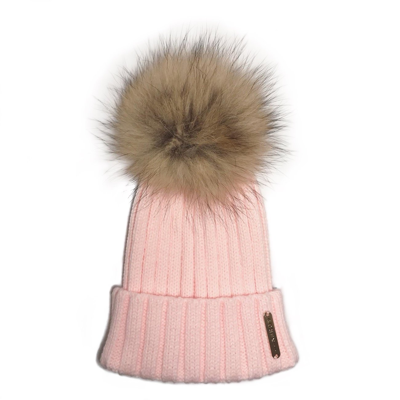 Luxury fur pom pom bobble hat in Candyfloss Pink with natural brown Pom and gold metal logo.