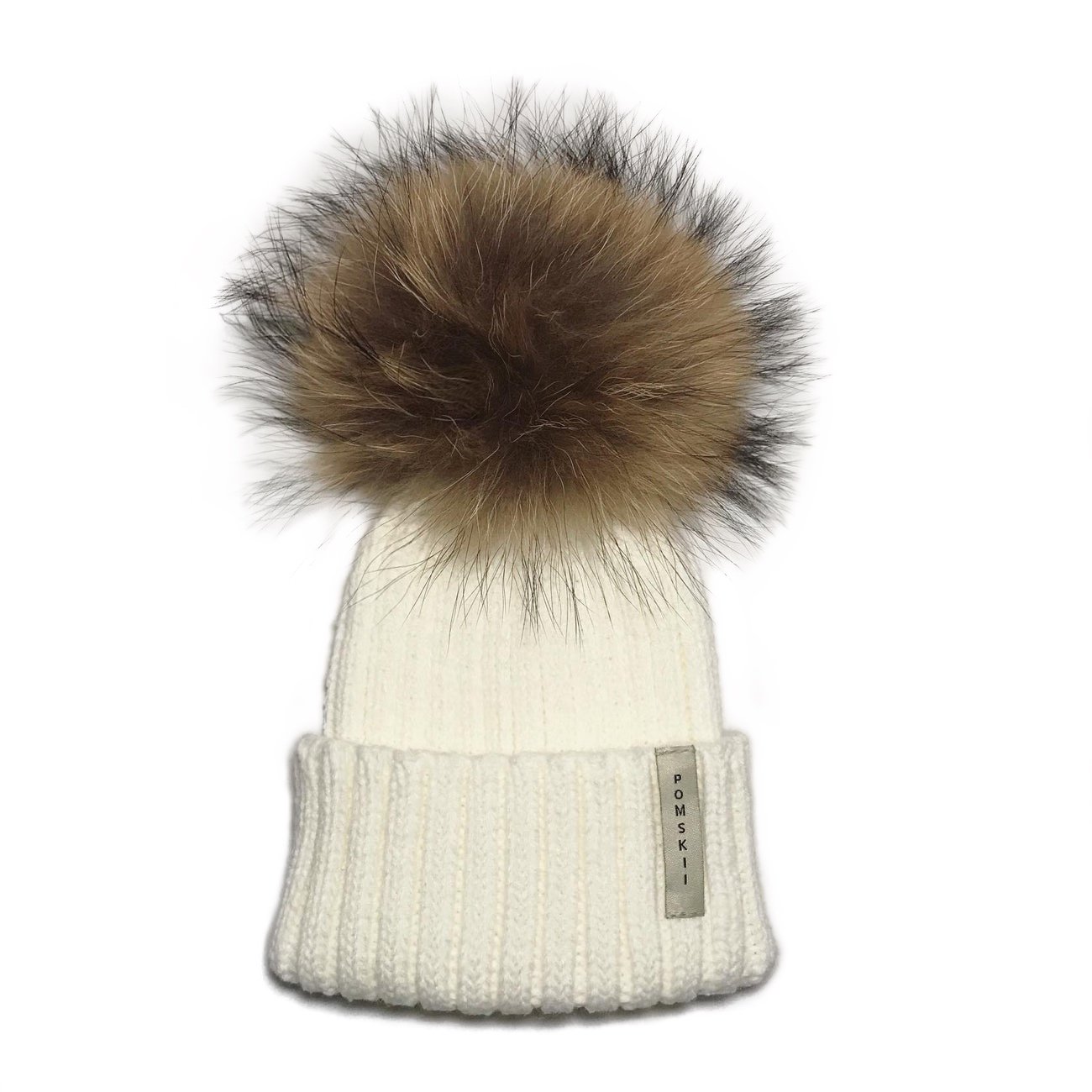 Children's luxury fur pom pom bobble hat in Vanilla with natural brown Pom.