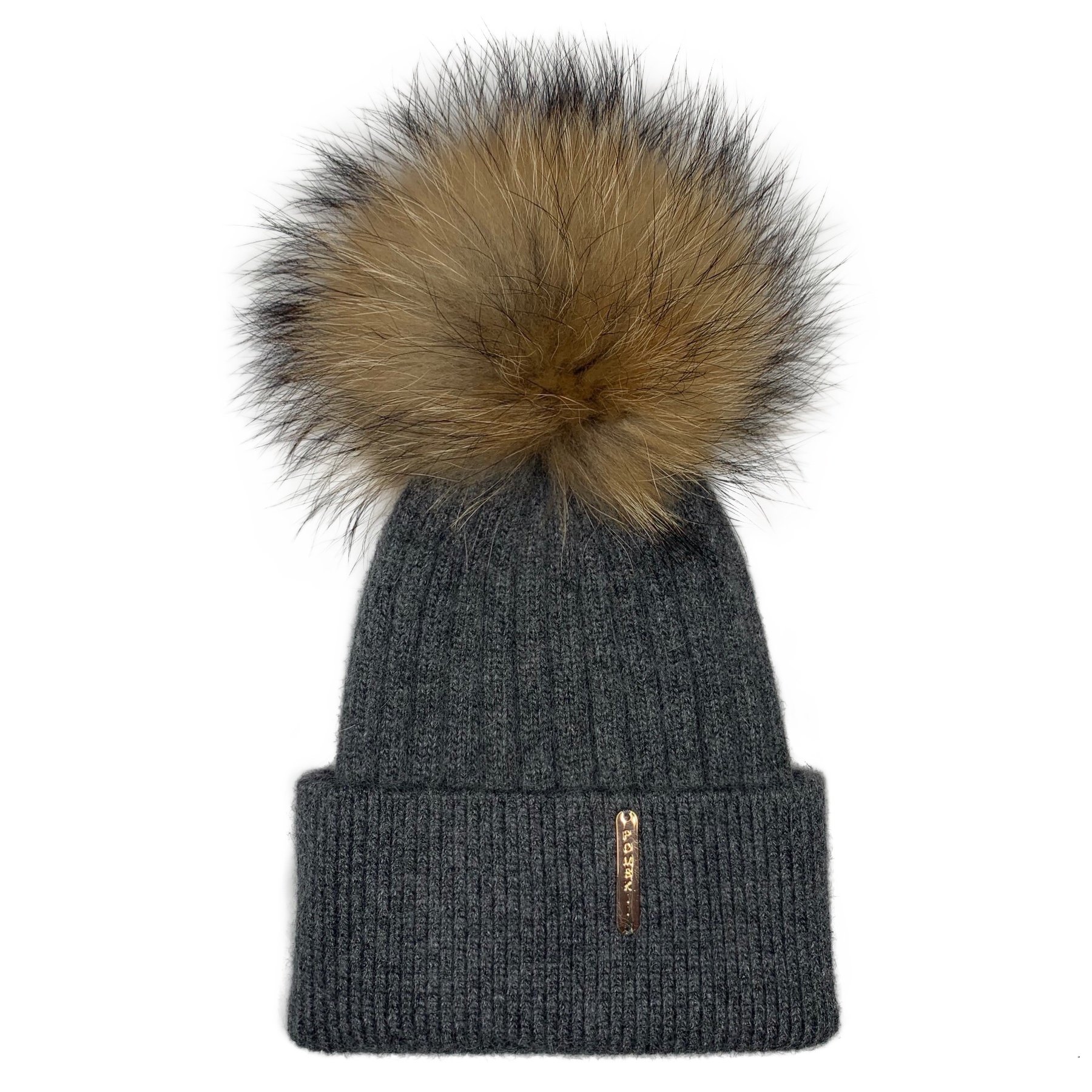 Chunky Knit Angora pom pom bobble hat in Dark Grey with natural brown Pom and gold metal logo.