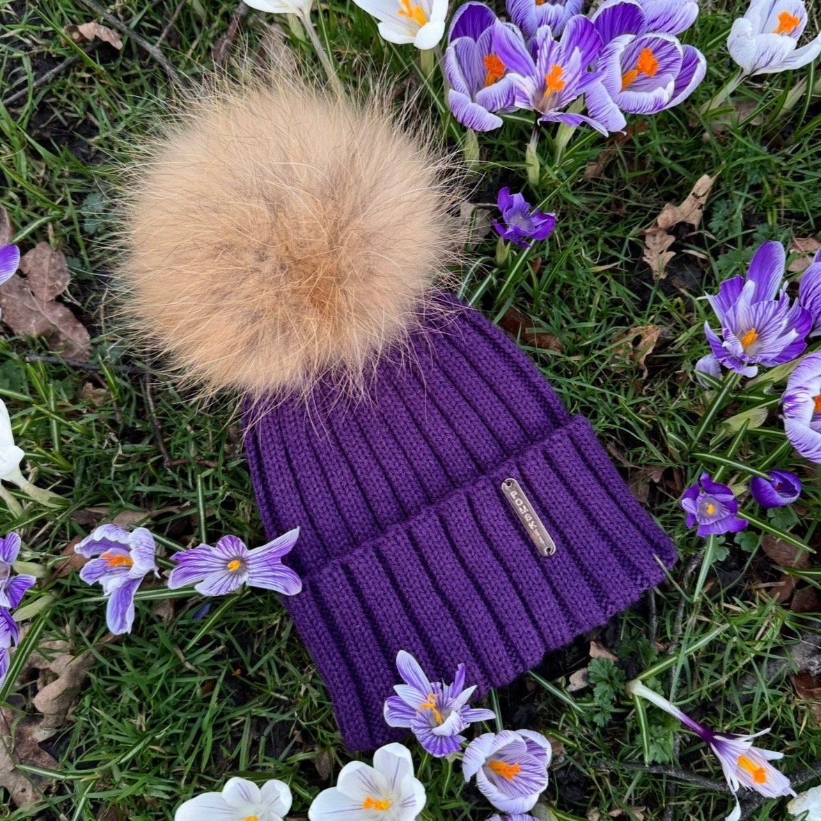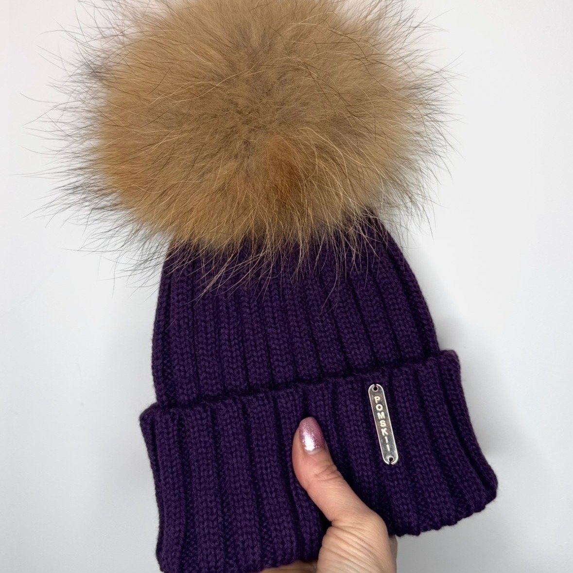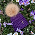 Luxury fur pom pom bobble hat in Purple with natural brown Pom and gold metal logo.