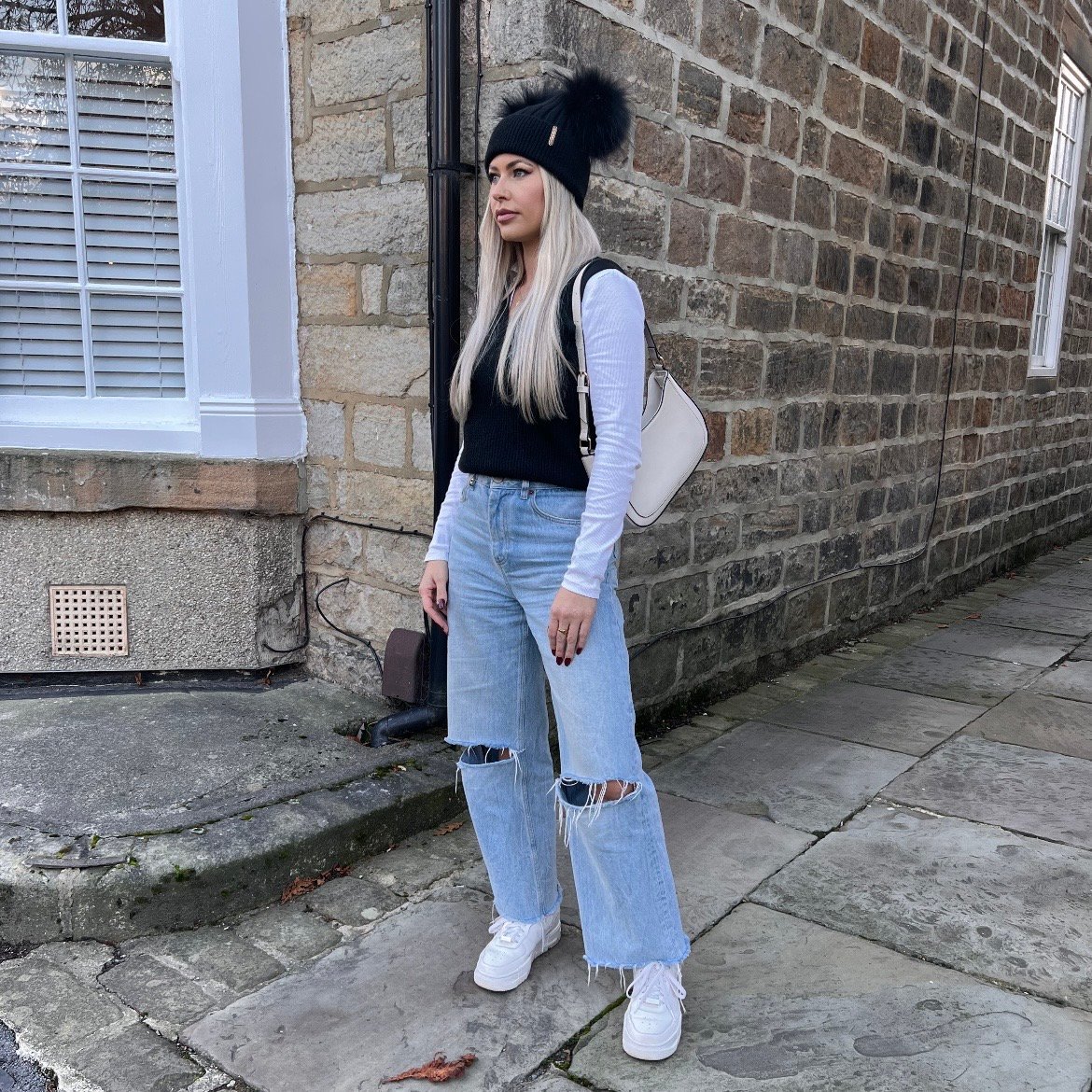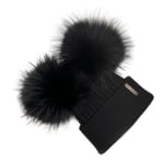 Angora double pom pom bobble hat in Black with double Black Poms and gold metal logo.
