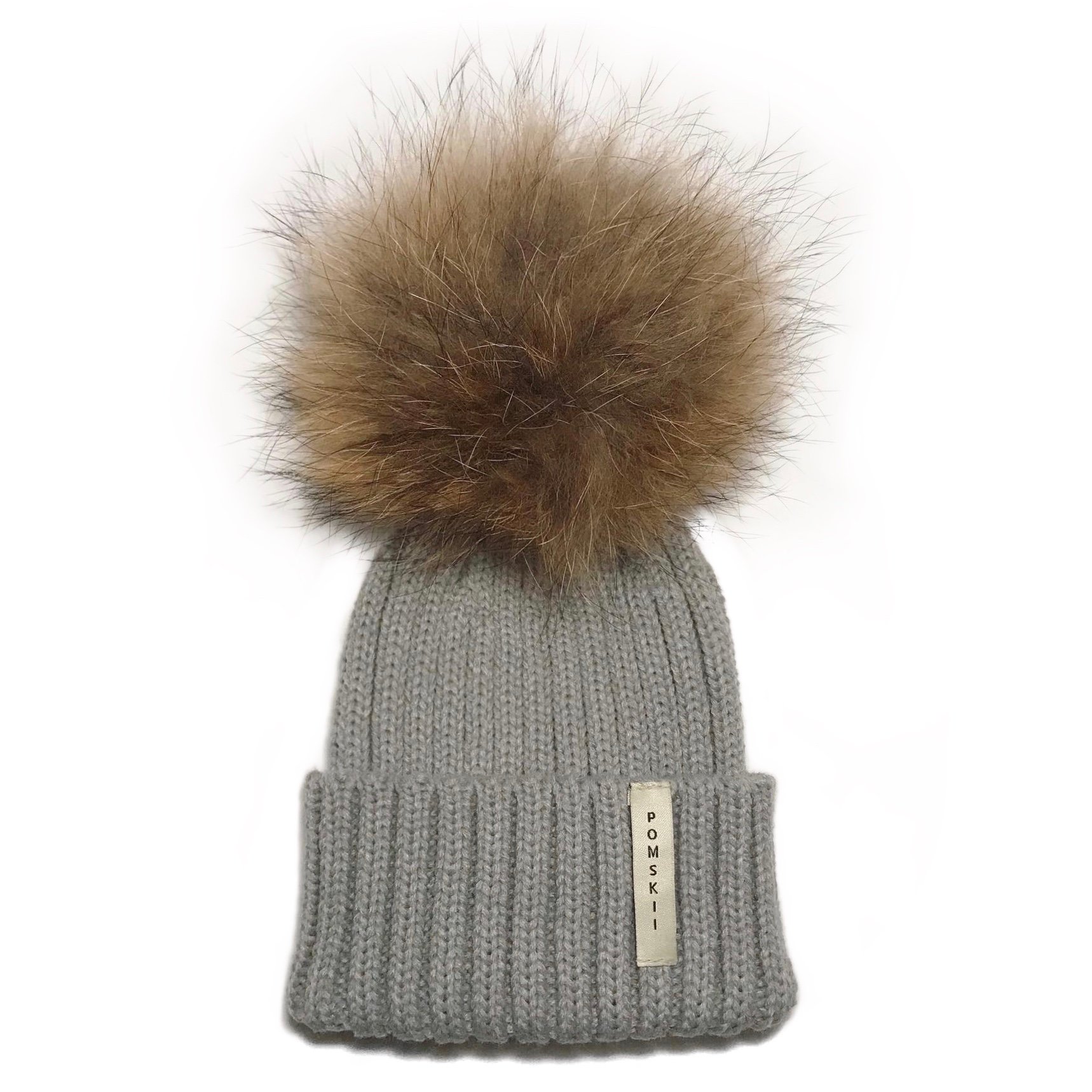 Children's luxury fur pom pom bobble hat in Pale Grey with natural brown Pom.